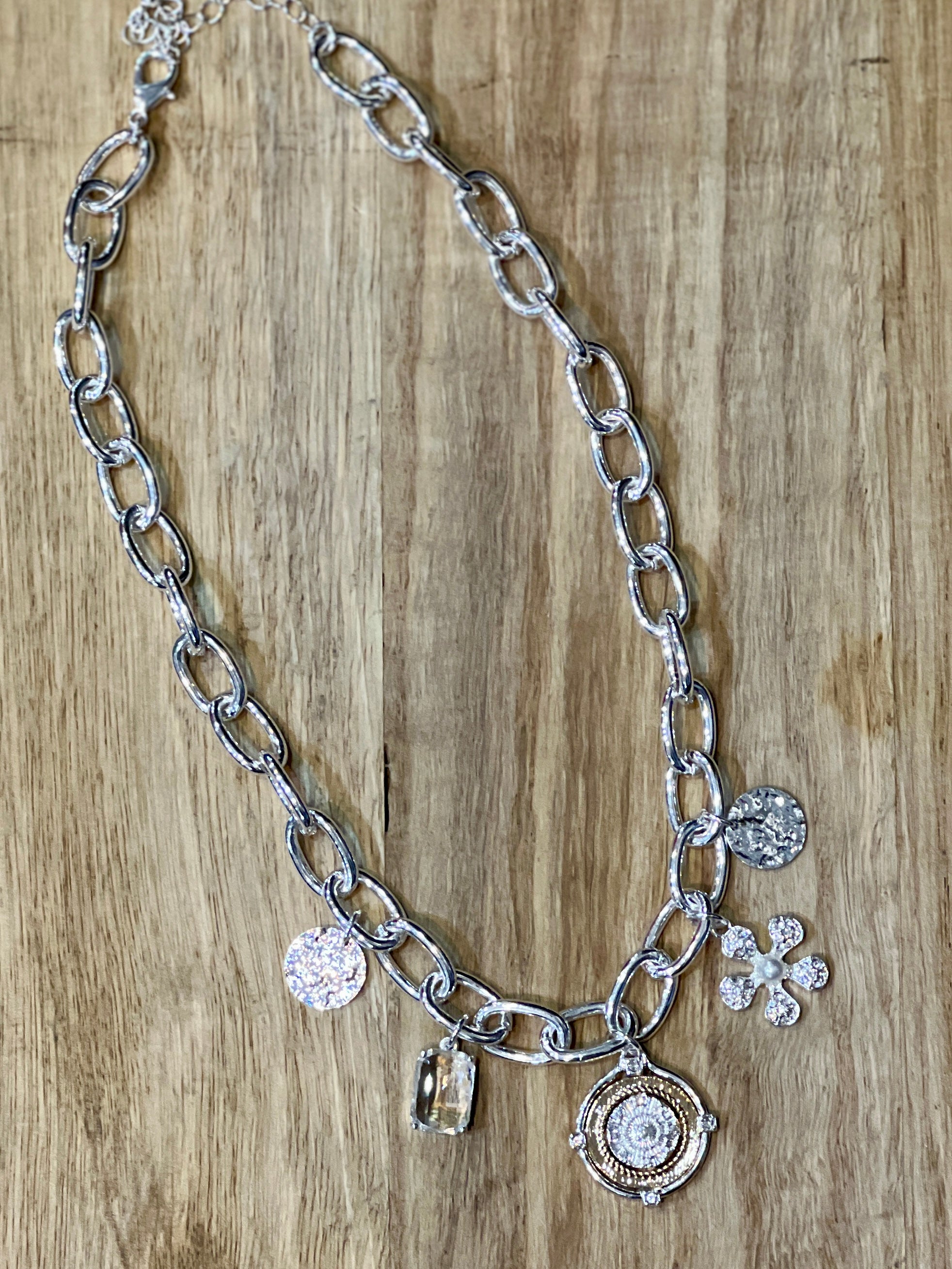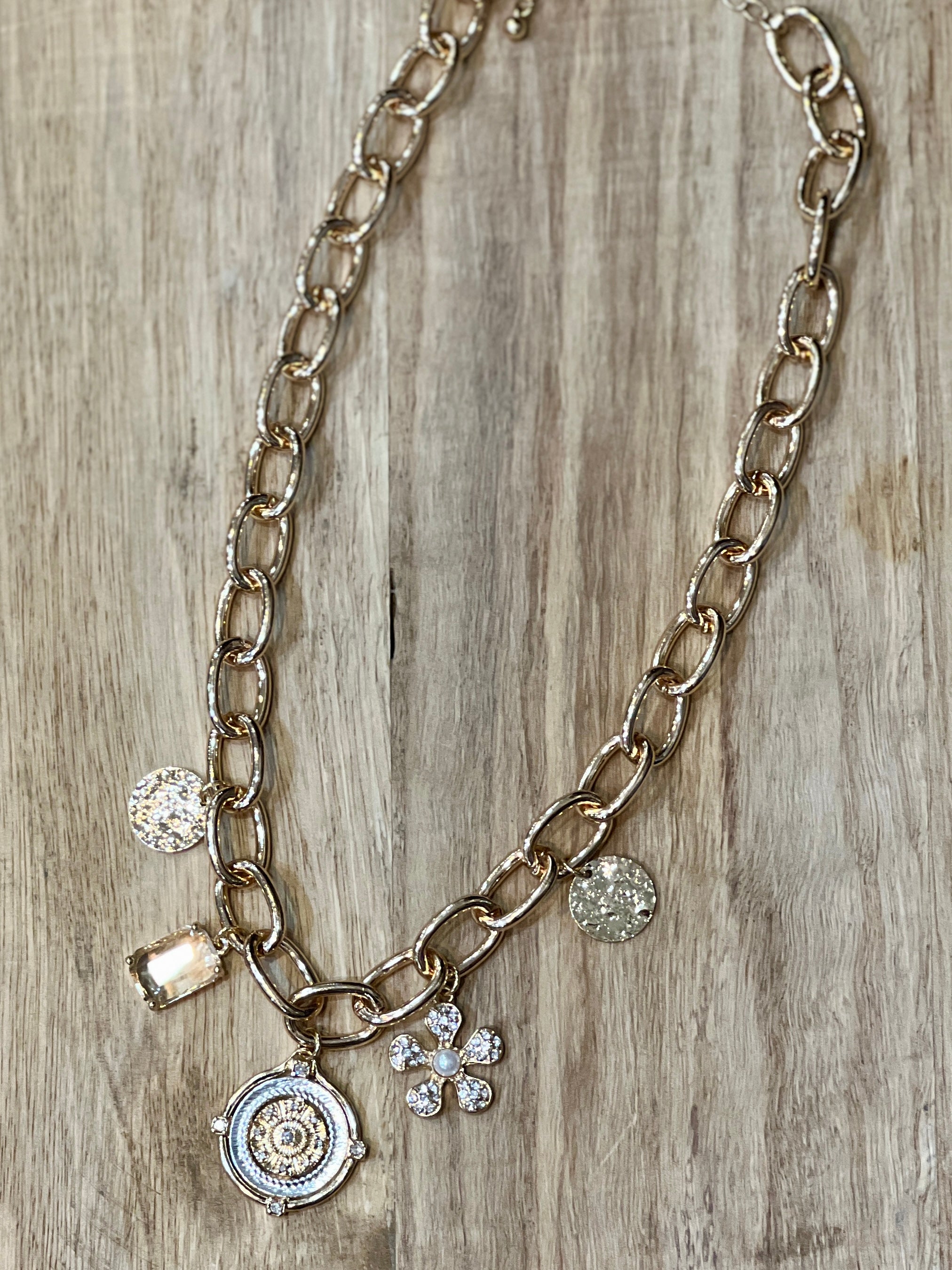 Chunky Charm Necklace with Coin Medallion, Daisy, Hammered Discs, and Chunky Clear Gemstone on a Chunky Chain Link, Available in Gold or Silver. 16" Plus 3" Extender, Goldtone or Silvertone, Fashion Jewelry.