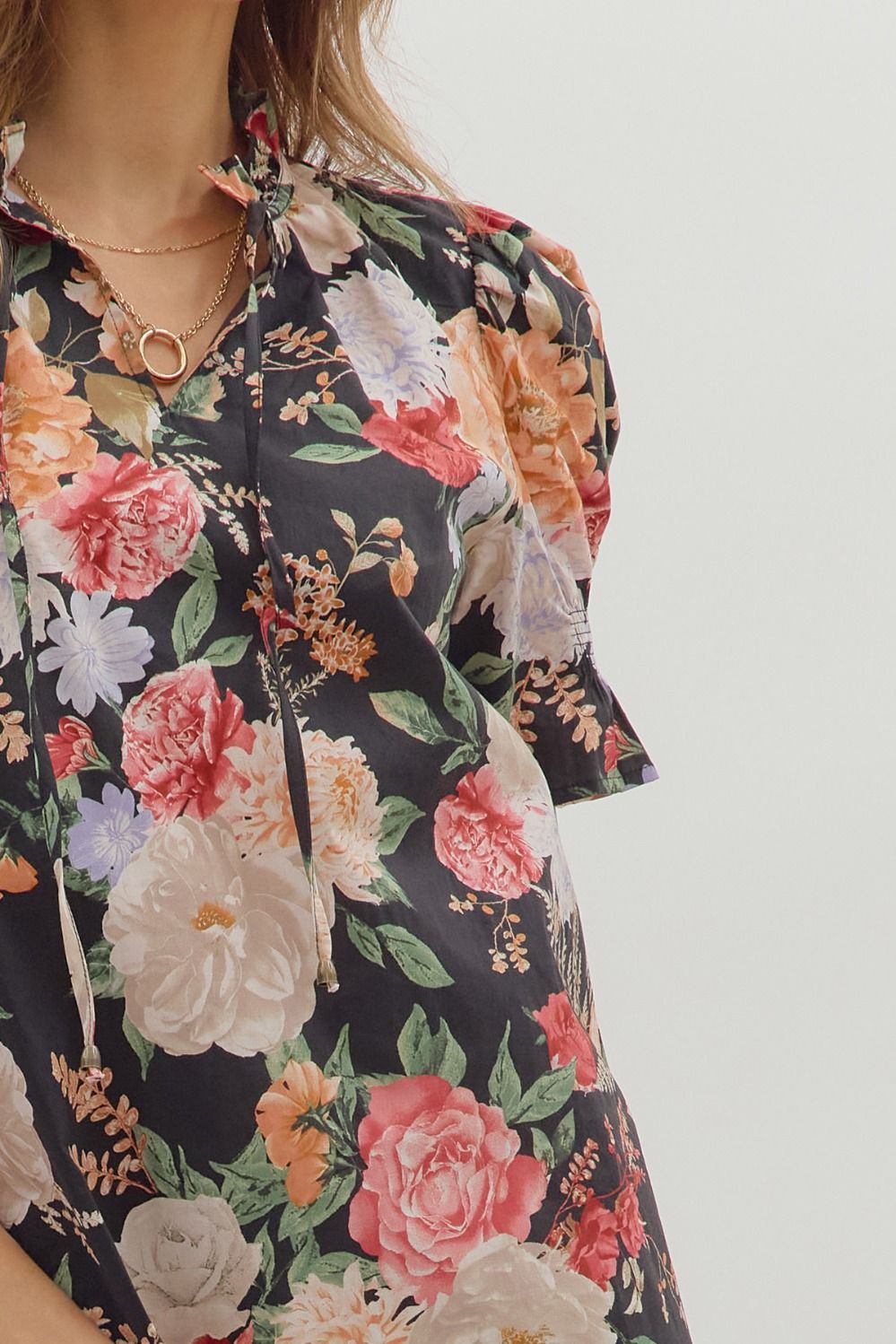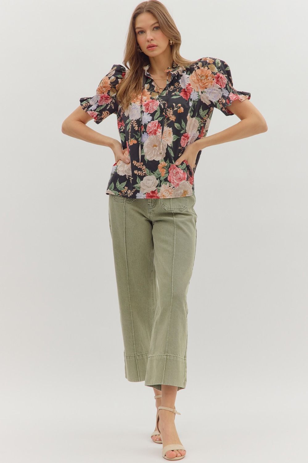 Baroness Garden Roses Floral Print Short Sleeve V-Neckline Top featuring a Ruffled Mock V-Neckline with Bow Tie Closure, Short Puff Sleeves with Smocked Ruffled Edges, Gorgeous Garden Roses Floral Pattern Rich Shades of Rust, Peach, Olive, Burgundy, Ivory, and Mauves on a Black Background in Gorgeous Lightweight Cotton Rich Fabric made of 97% Rayon, 3% Spandex. Black Floral, Available in Small, Medium, and Large.