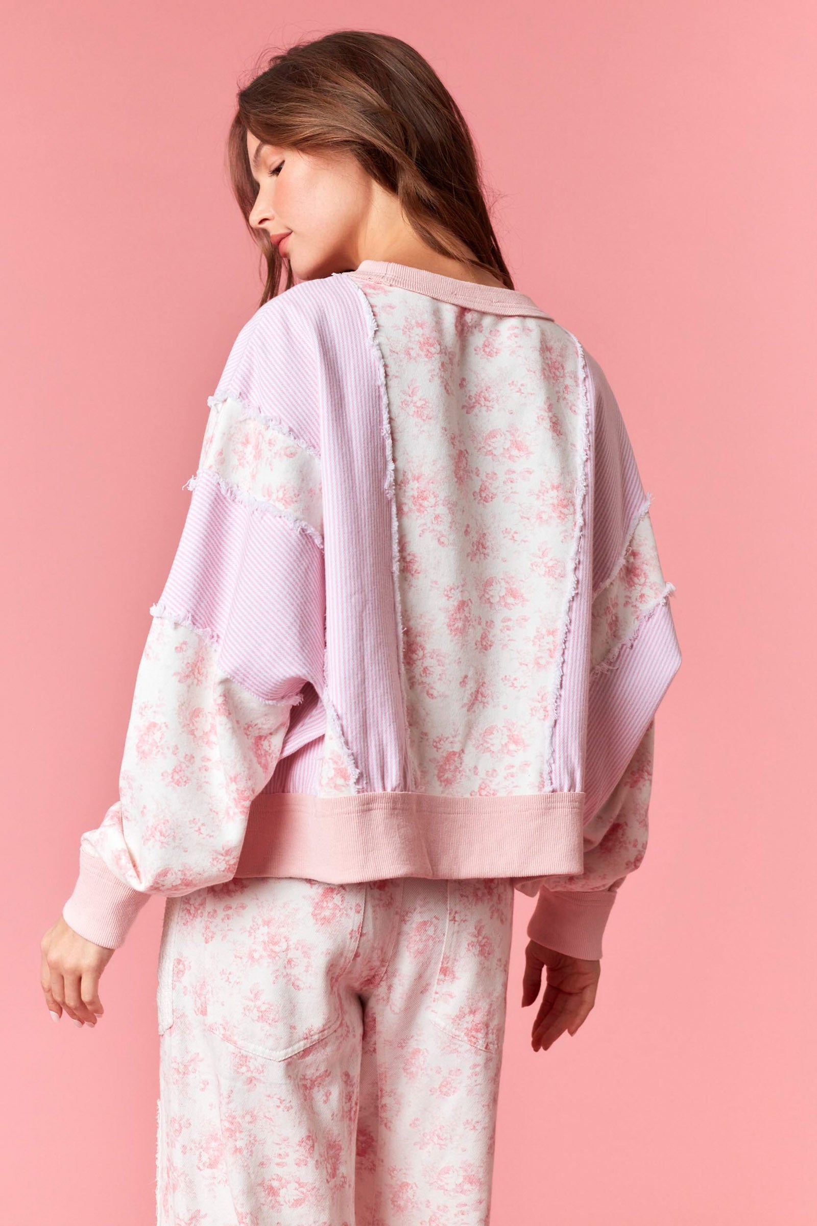 Rosita Vendela Floral Printed French Terry & Pinstripe Twill Bat Wing Pullover features Raw Edge Seam Details, Crew Neckline with a Wide, Oversized Fit, Banded Cuff Long Sleeves, and a Wide Banded Hemline. We are OBSESSED with the Sweet Floral Print Mixed with the Striped Twill, perfect for Spring, Valentine's Day, or with your Favorite Jeans! Pink Floral Only, Available in Small, Medium, and Large.