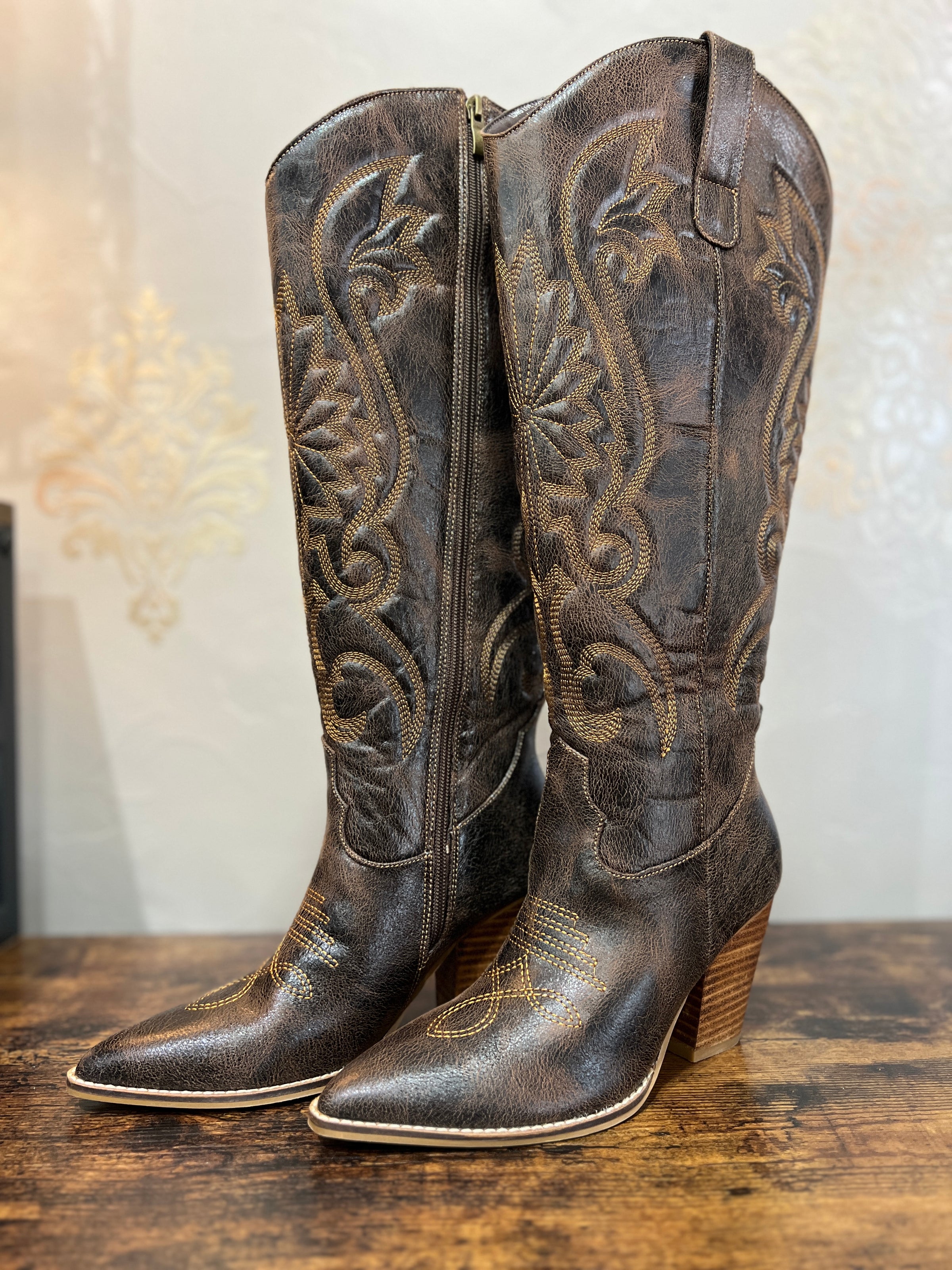 Looking for the Perfect Western Boot for Concerts or Rodeos that will Turn Heads and Keep you Corkys Comfortable? It's Here, in Limited Supply! Hey Girl by Corkys "Long Live Cowgirls" Espresso Crinkle Tall Western Style Boots, the Comfiest Boots you will own! The Espresso Crinkle Color is the has the Perfect Aged and Worn Neutral Look to pair with any outfit, Jeans or Dresses! Long Live Cowgirls features a Pointed Toe, Gorgeous Western Stitching on the Toe and Upper, Outside Pulls, Soft Padded Calf Shaft, 3" Heel Height, as well as the Famous Corkys Soft Memory Foam Insoles for all day Comfort, and a Full Inside Zip Closure. Limited Sizes Available in Espresso Crinkle in whole sizes only 7-11.