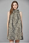 Imelda Floral Patten Jacquard, High Neckline with Back Bow Tie A-Line Mini Dress features a High Mock Neckline with Slight Gathers and Large Bow-Tied in the Back, Sleeveless Styling with Back Pleats for Fullness, and a Party Mini Length in a Full and Flowy A-Line Silhouette. Gorgeous for Holidays, Parties, Weddings, New Years, or Photographs. The Fabric is a Beautiful Olive, Champagne, and Black mix Floral Damask Jacquard, that is so elegant for Special Occasions! 100% Polyester, Lined 97% Polyester 3% Spandex, Available in Small, Medium, and Large.