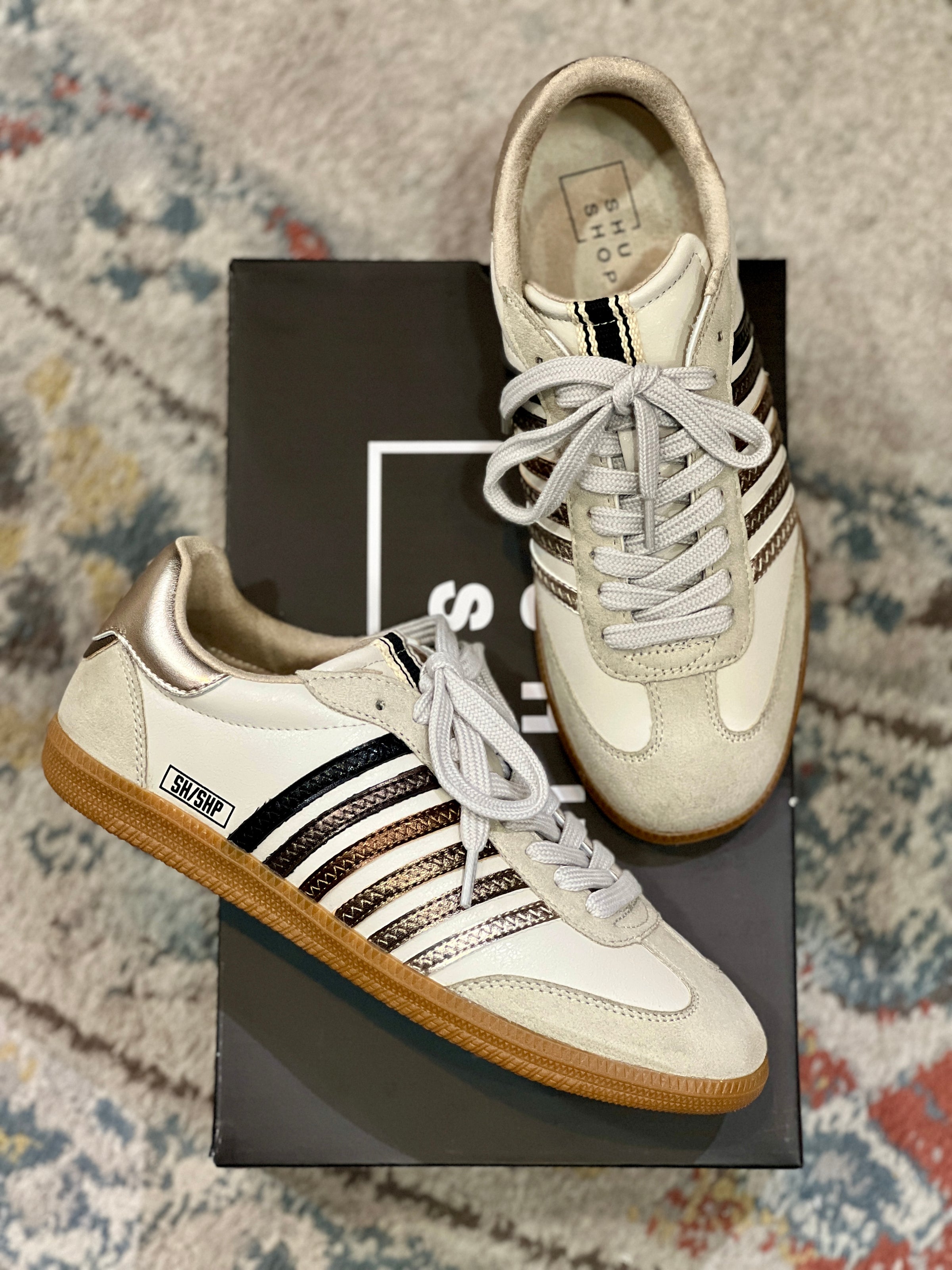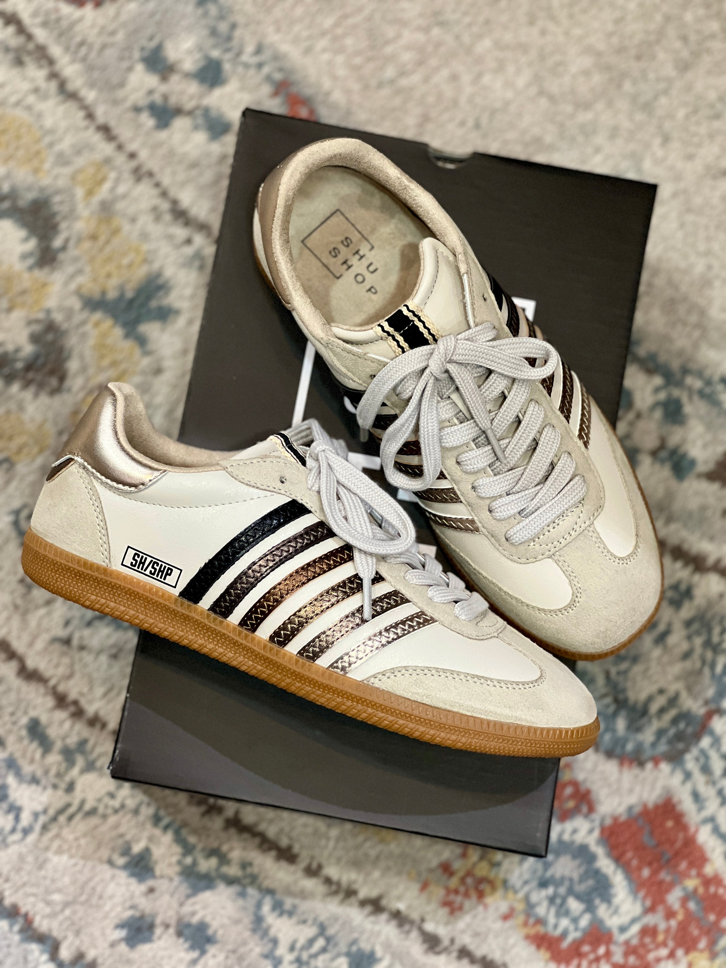 Step up your game with STEVIE in Metallics! This retro-inspired sneaker redefines cool, featuring bold-to-soft ombre' metallic stripes and a matching heel accent. Crafted from luxe faux leather suede and finished with a gum sole, it's the perfect mix of style and comfort. Ready to own the spotlight? We think YES! We love that this Color Combination Coordinates with ANYTHING! Definitely one of our Favorites! Metallics, Available in sizes 6.5, 7, 7.5, 8, 8.5, 9, 10, and 11.
