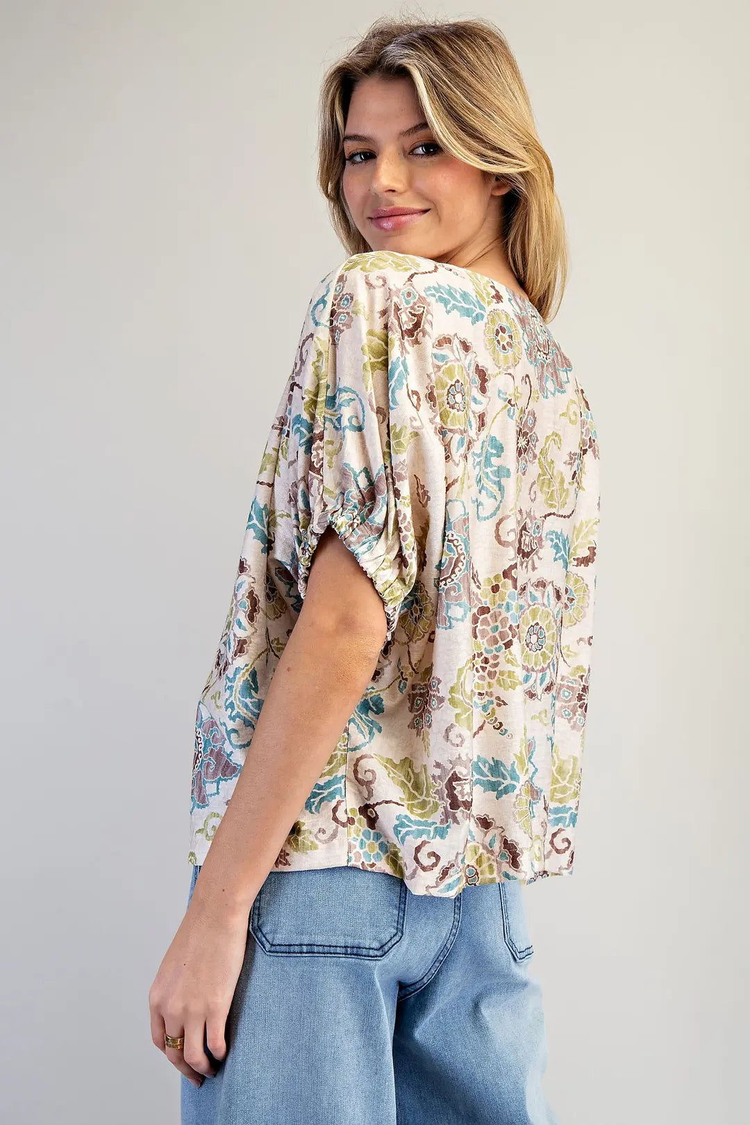 Tulum Vintage Botanical Drop Elastic Sleeve Boho Floral Print Blouse Top features a Rounded Boat Neckline, Half Dolman Sleeves with Elastic Cuff, and a Loose, Boxy Fit in a Lightweight, Soft, & Flowy Fabric. We love the Subtly Textured Fabric that brings a Vintage Bohemian Floral Charm! 87% Viscose, 13% Nylon, Available in Vintage Botanical Print in Sizes Small, Medium, and Large.