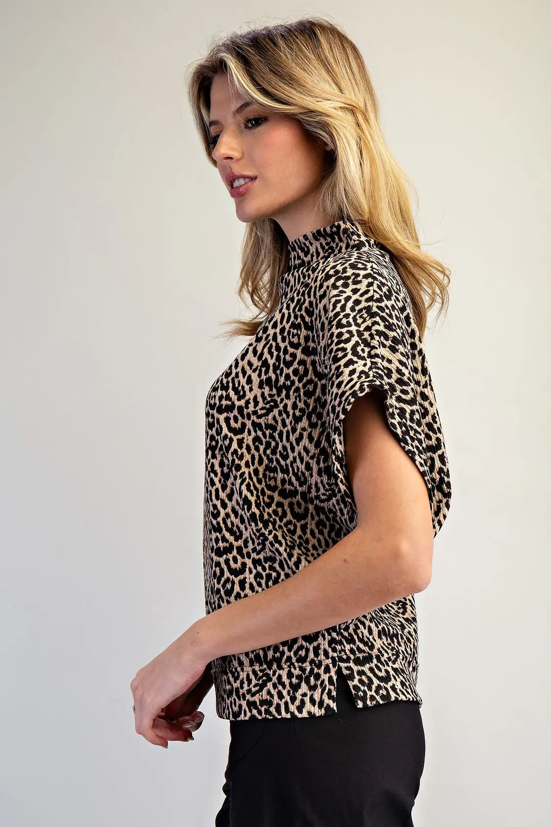 Varali Leopard Print Mock Neck Dolman Sleeve Top ✨ features a Relaxed, Mock Neckline, Wide Dolman Short Sleeves, Subtle Side Slits, and a Lightly Banded Hem for an Easy, Draped Silhouette with a Sleek, Modern Edge. We LOVE the Lightly Textured Knit, which adds Softness, Depth, and Character to the Classic Leopard Print! 95% Polyester, 5% Spandex, Leopard Print, Available in Small, Medium, and Large.