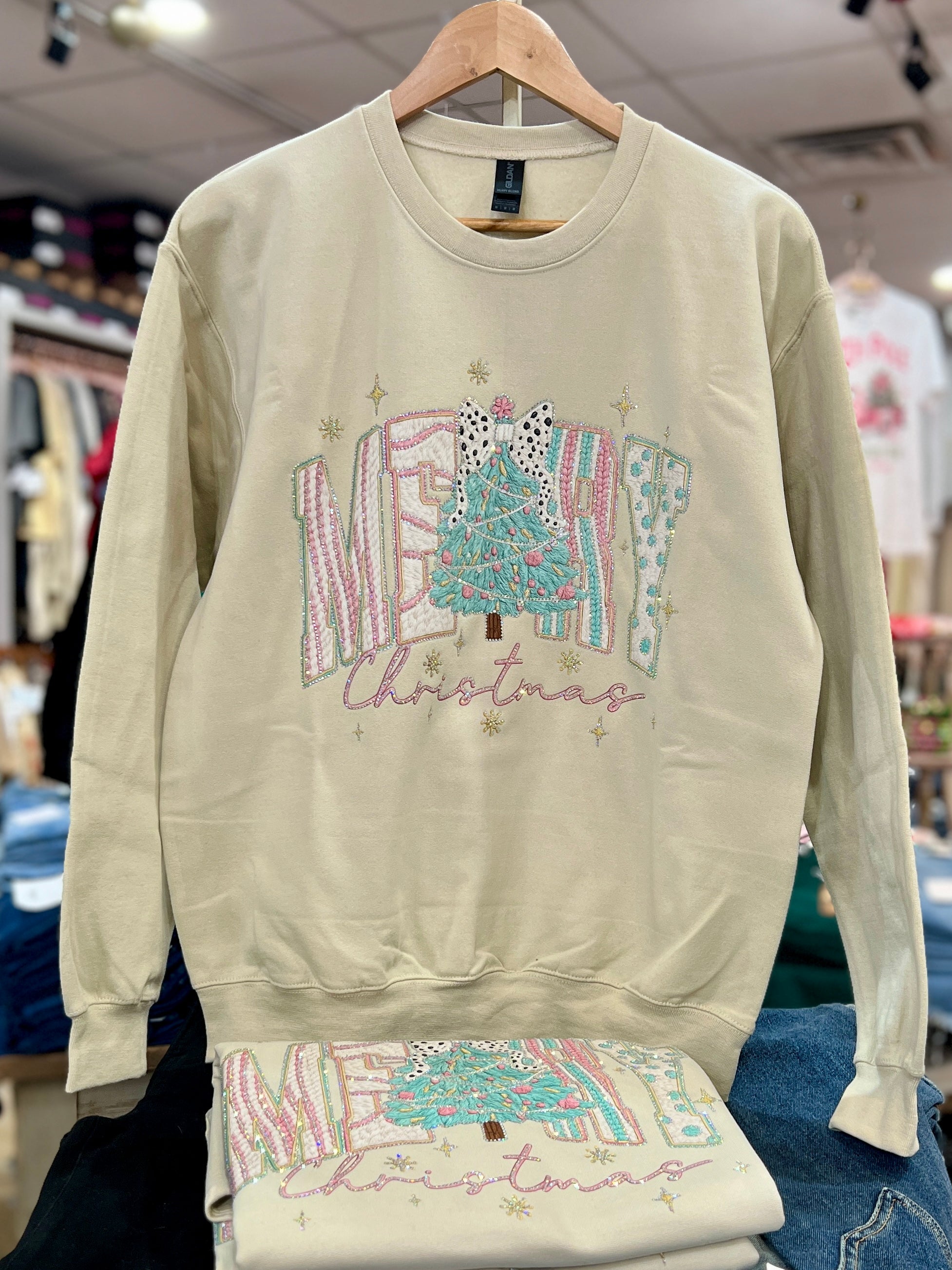 Yarn Pastel MERRY Christmas Bejeweled Long Sleeve Graphic Crew Sweatshirt. Cute Holiday Design in Soft Pastel Colors featuring MERRY Christmas Tree Design is Yarn-like Artwork Bejeweled in Handset AB Crystals. Beige, 50% Cotton, 50% Polyester on Gildan Heavy Blend Shirts, DTF Printing, Available in Small, Medium, Large, XLarge, and 2XLarge.